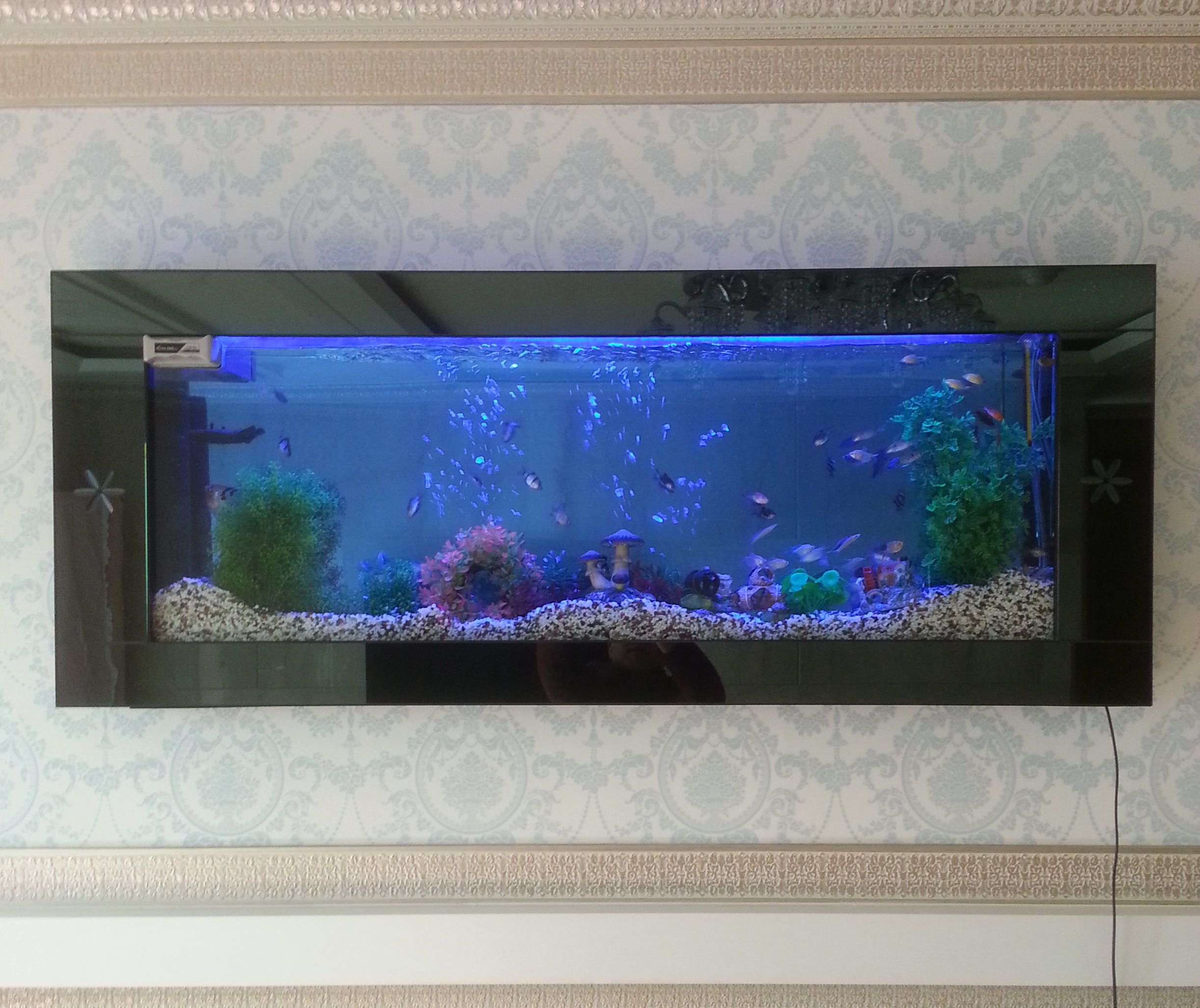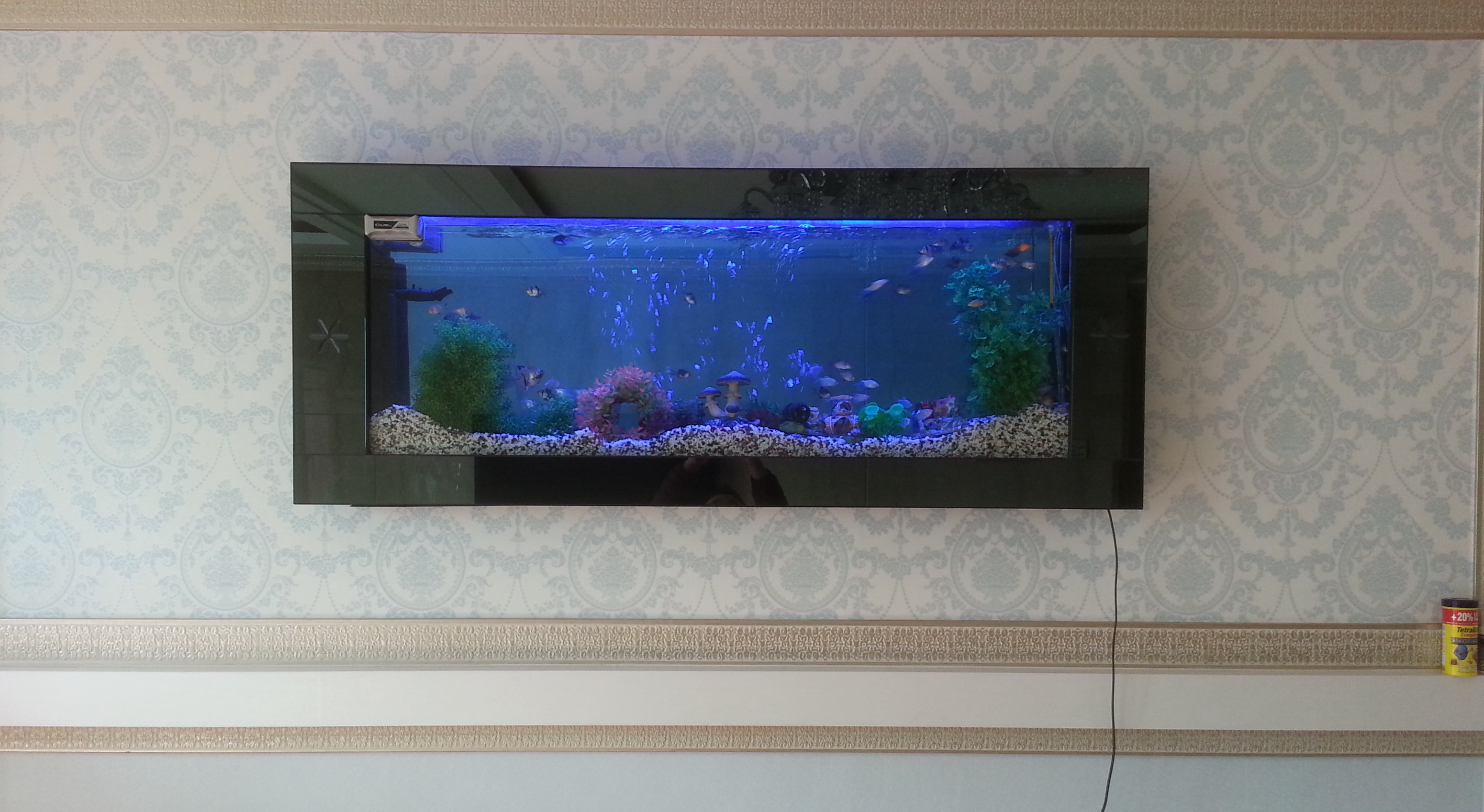 아파트 거실벽쪽에 흑경1800벽걸이어항을 설치