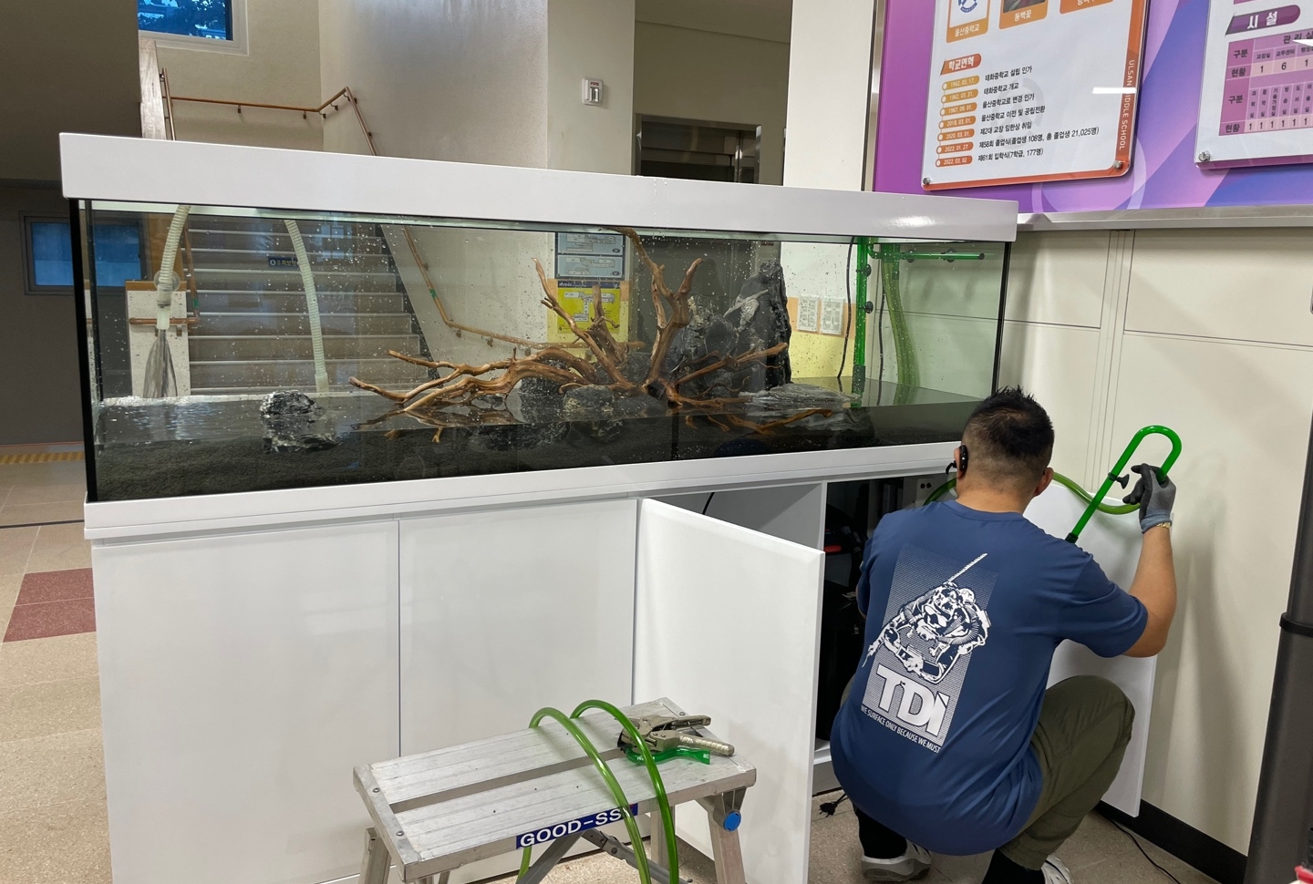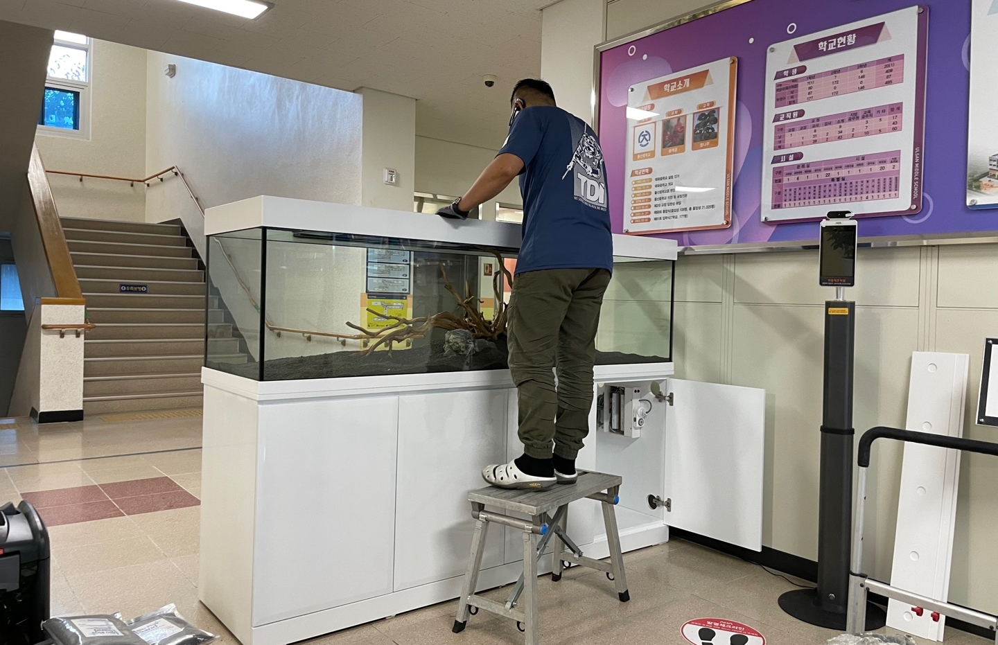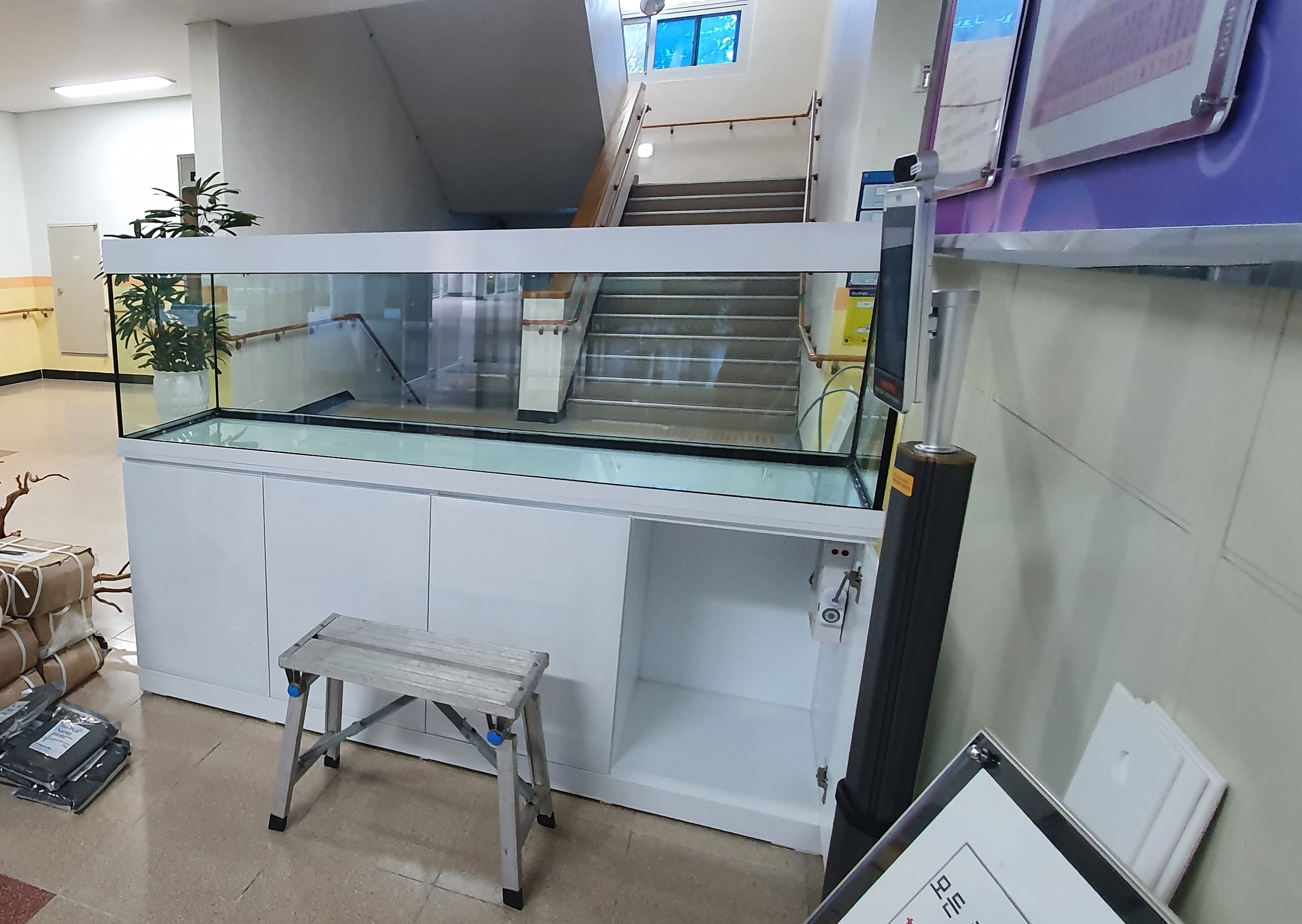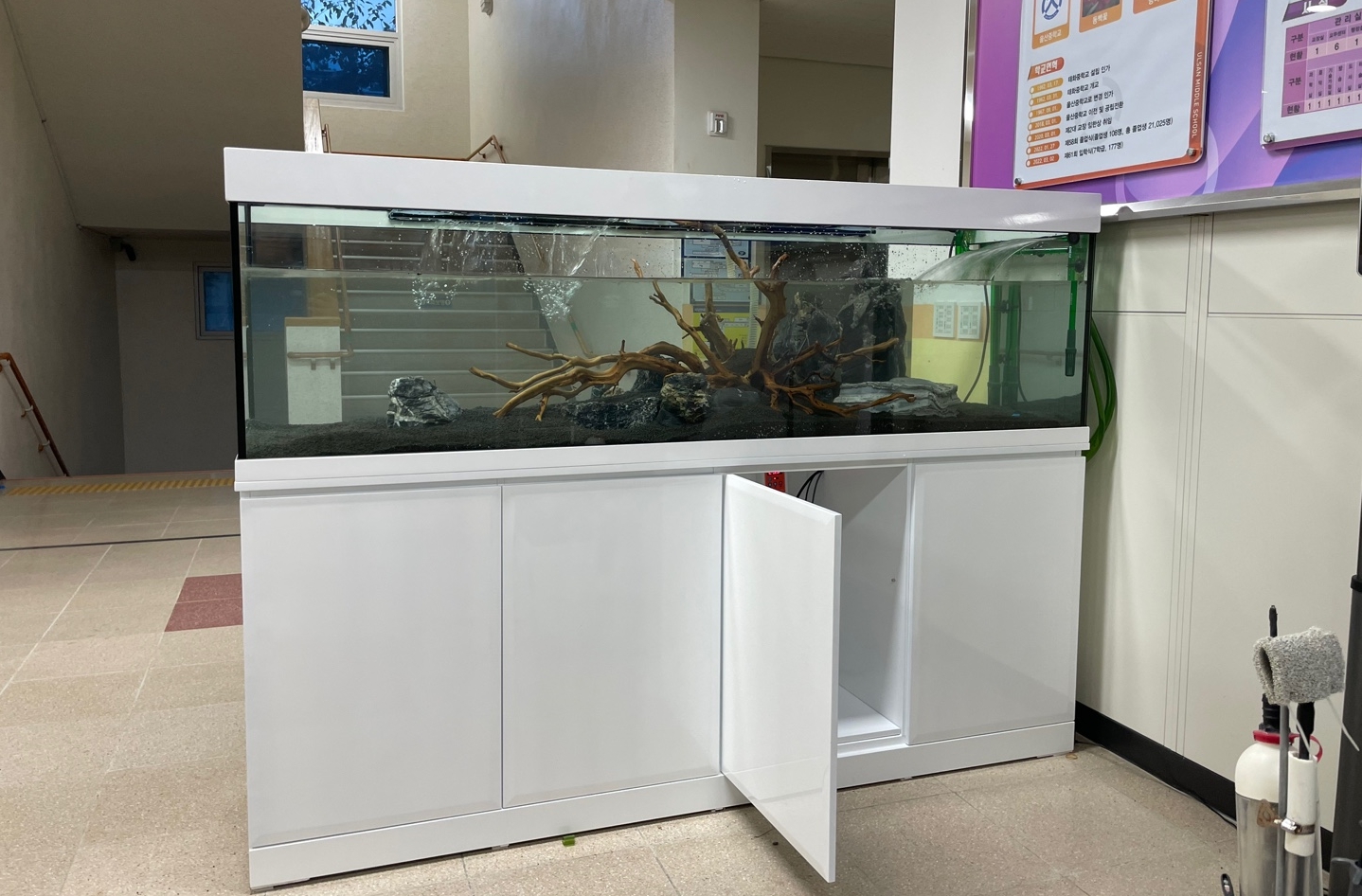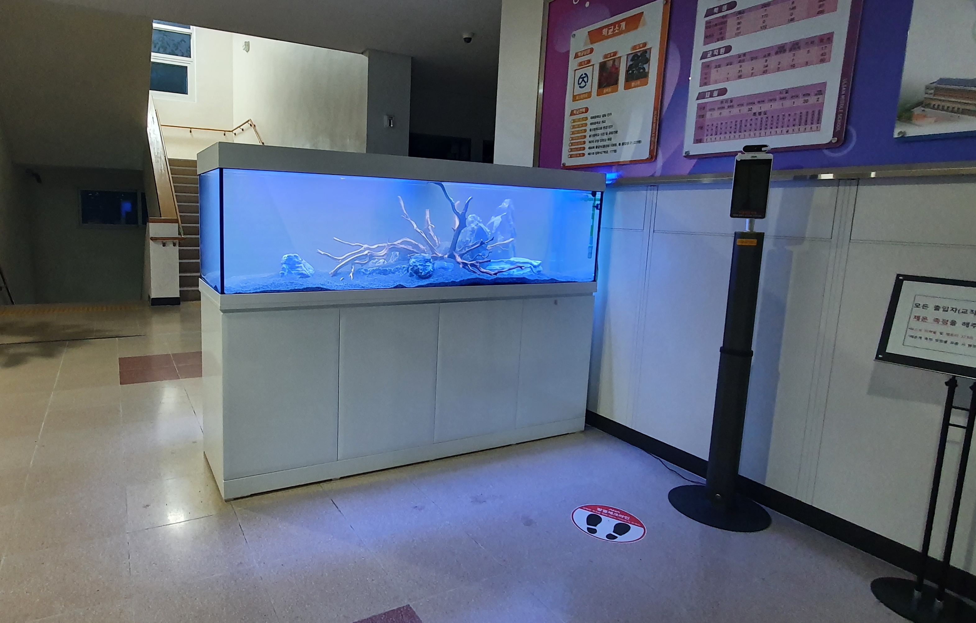 중학교...1층 로비에 설치된 2100수초어항...